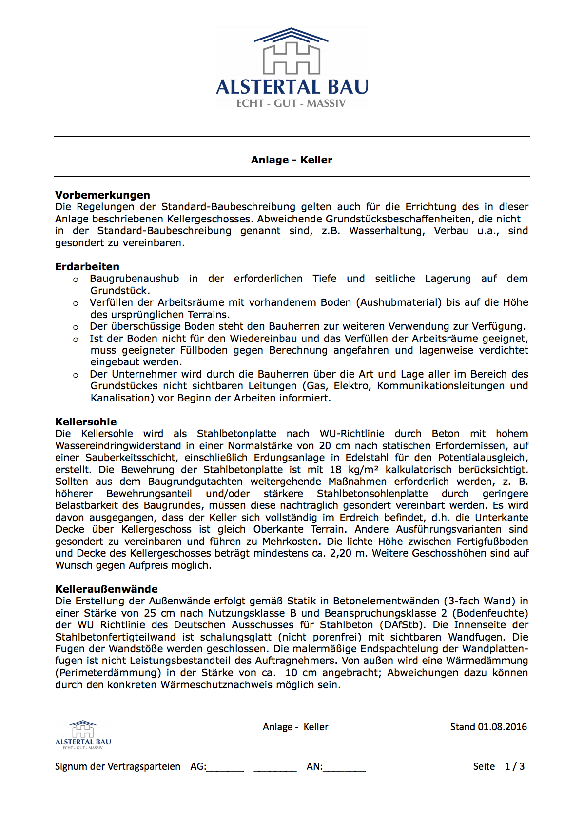 Alle tragenden Außenwände werden aus Porenbeton erstellt (auf Wunsch auch Kalksandstein) und erhalten einen Edelputz. Innenwände aus Kalksandstein. Bei Verblendfassade kann auf Wunsch ein imprägnierter Stein mit Ausblühschutz zur Verwendung kommen.